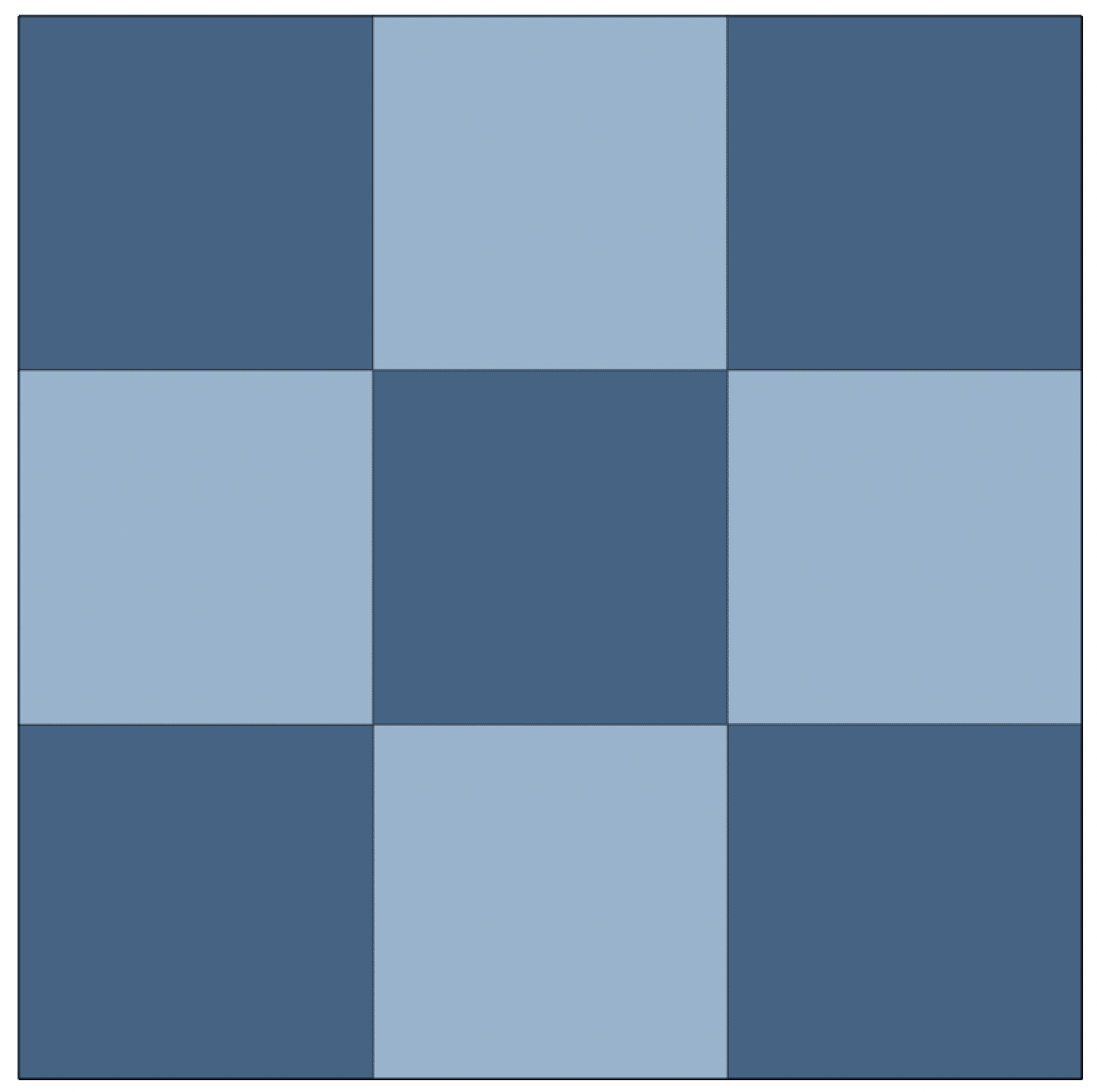 A Nine Patch block is made from nine equal squares arranged in three rows of three. That’s where the name comes from — nine patches sewn together to create a 3 × 3 grid.